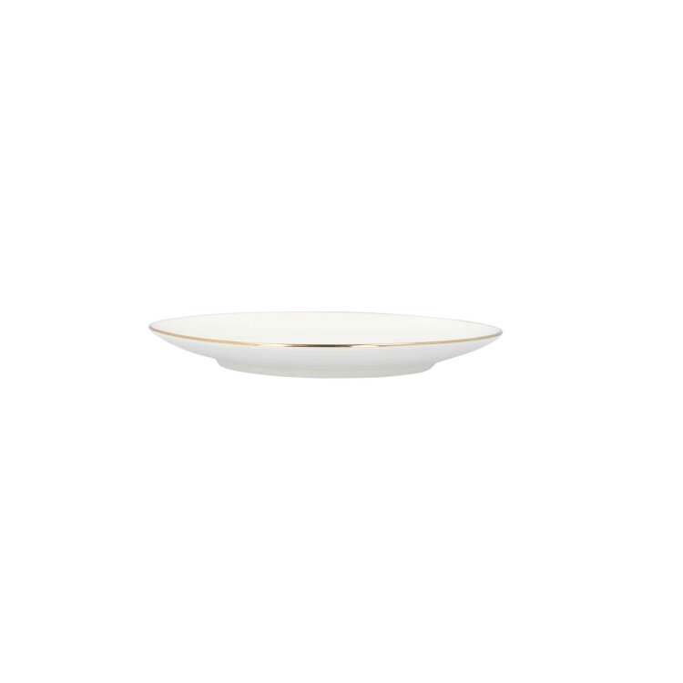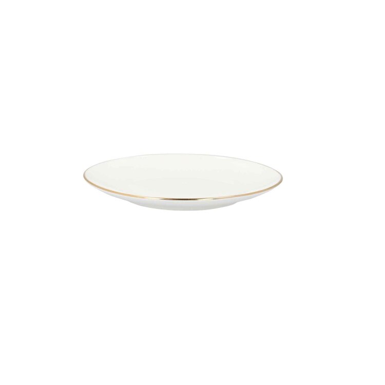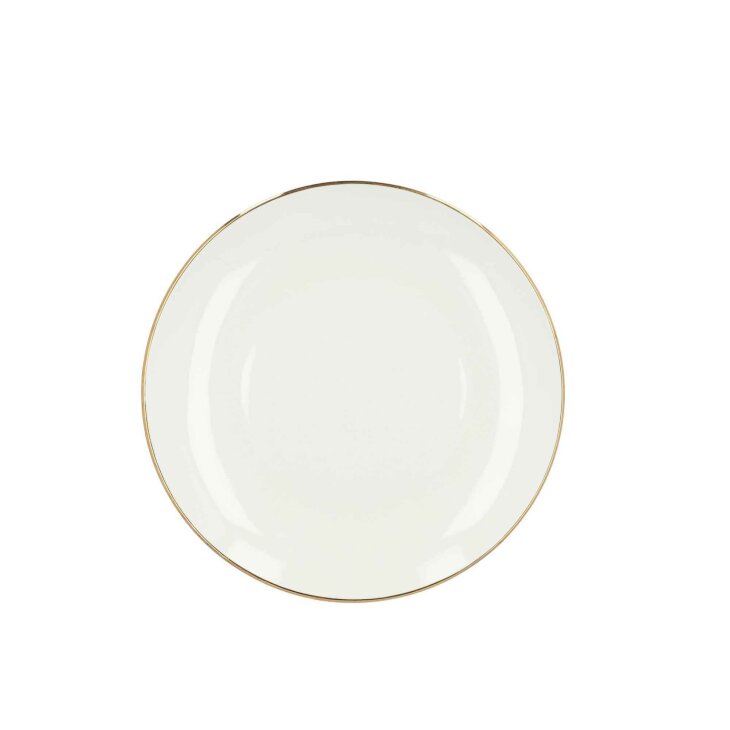 AURO desertni tanjur je jednostavnog kružnog oblika promjera 19 cm. Ima vrlo minimalistički oblik, jer su blago uzdignuti rubovi ukrašeni samo delikatnim ukrasima u klasičnom zlatu. Tanjur se odlikuje gotovo asketskom jednostavnošću, pa će izgledati dobro na svakom stolu. Izrađena je odporculana u krem ??i ekru boji.
