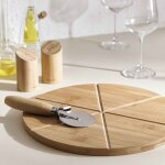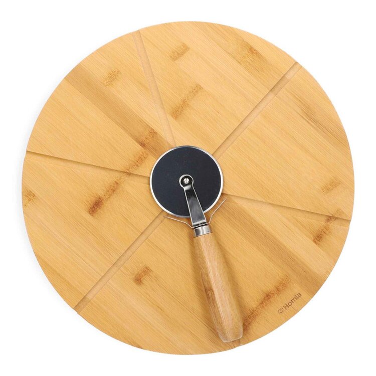 Set uključuje dasku za pizzu promjera 32 cm i nož (naglavak). Nož ugodno leži u ruci, jednim pokretom možete narezati svoj omiljeni talijanski specijalitet. Okrugla daska od bambusa, pogodna za jednostavno rezanje pizze i serviranje izravno na stol. Proizvod ima male prostore koji pomažu podijeliti tijesto na šest jednakih dijelova. Ekološki stil i dizajn seta otkrivaju moderne trendove koji mogu zavladati u vašem domu.Materijal