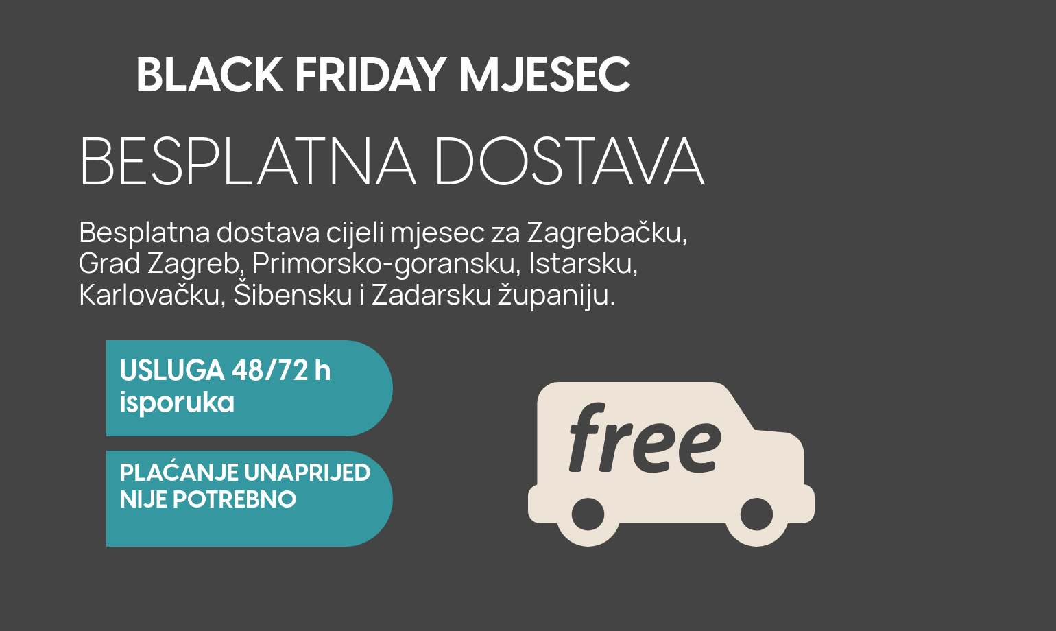 Cijeli mjesec studeni dostavljamo potpuno besplatno u Zagrebačku, Grad Zagreb, Primorsko-goransku, Istarsku, Karlovačku, Šibensku i Zadarsku županiju.