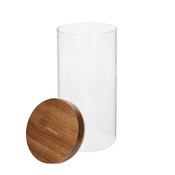 Posuda CARLOS ističe se svojom minimalističkom estetikom koja će se uklopiti iu kuhinje u skandi i boho stilu i svugdje gdje akcenti prirodnih materijala imaju važnu ulogu u prostorijama. Staklena kuhinjska posuda je cilindričnog oblika i zapremine 1,2 litre. Visina mu je 22 cm. Također ima zapečaćeni poklopac izrađen od prirodnog drva, na kojem se nalazi fino ugraviran grb Homela.