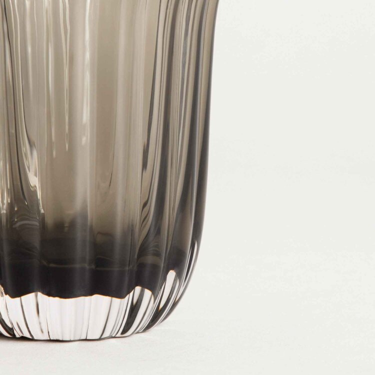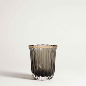 Tražite li čašu koja će vašem stolu dodati dašak šika? SCURO je elegantan prijedlog od zadimljenog stakla, završenog ukrasnim zlatnim rubom. Njegova rebrasta struktura daje mu jedinstven karakter i čini da lijepo reflektira svjetlost.