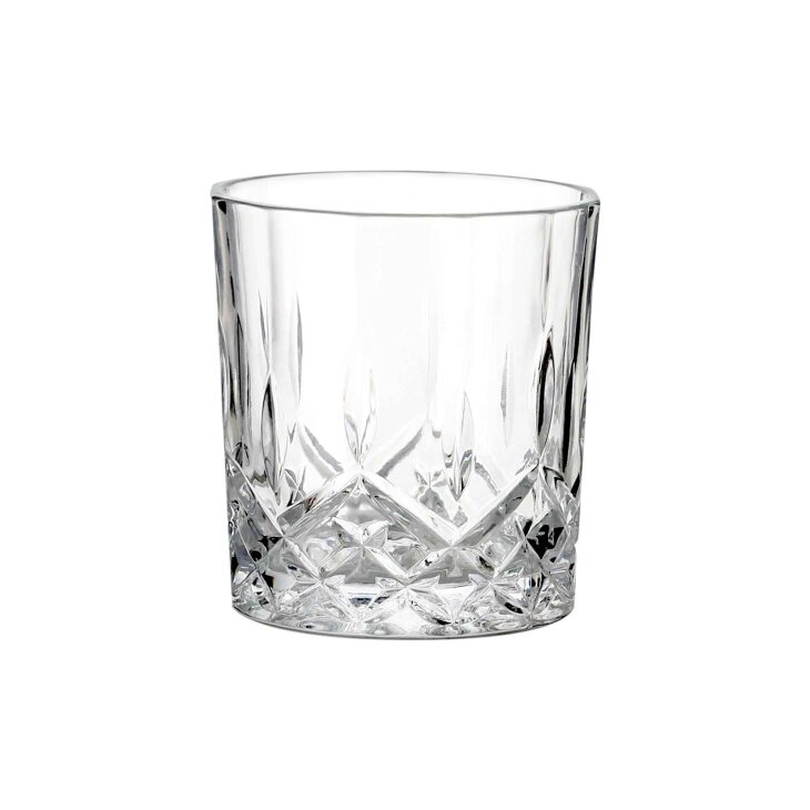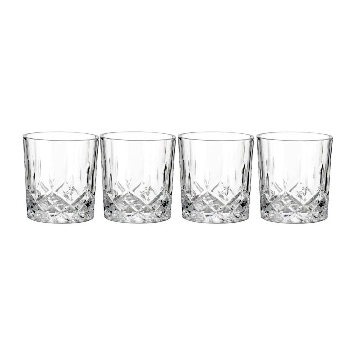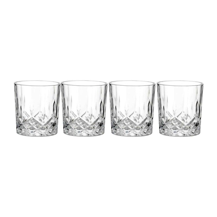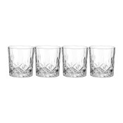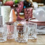 sastoji se od 4 čaše cilindričnog oblika. Dno naočala ima utisnute geometrijske uzorke. Prozirna boja proizvoda omogućit će vam da ih bez problema uskladite sa svojim posuđem. Elegantne čaše upotpunjene šarenim koktelima, pićima ili bezalkoholnim pićima izgledat će nimalo sofisticirano. Set se može pokazati i kao dobra ideja za poklon.Materijal