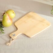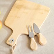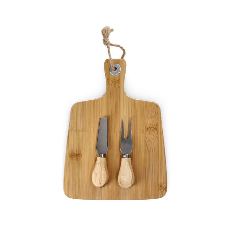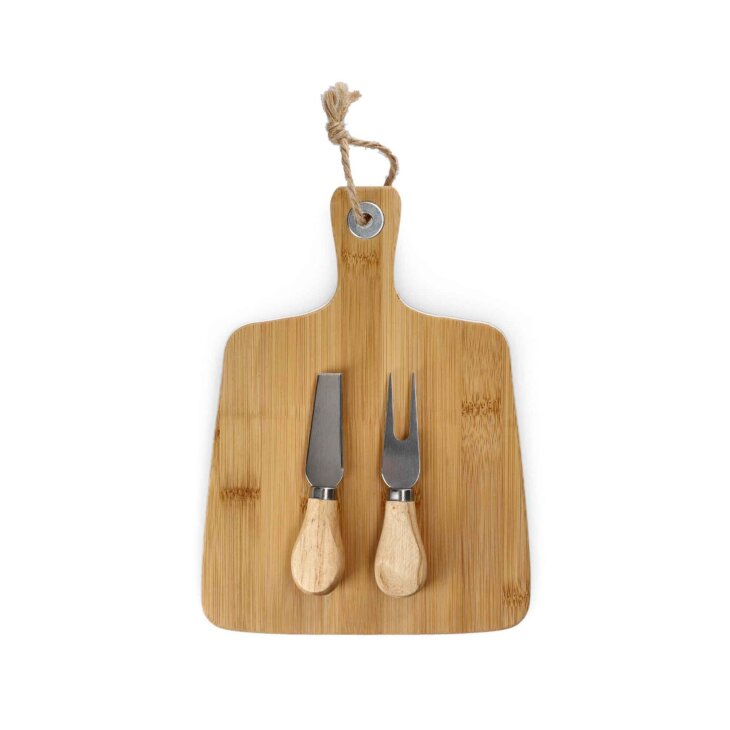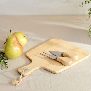 BAMBOU set sastoji se od bambusove daske i dva noža za sir od 12 cm. Daska ima klasičan oblik i udobnu ručku s omčom za vješanje. Dimenzija je 26 x 19 cm. Noževi su dizajnirani za dijeljenje, rezanje i posluživanje sira.