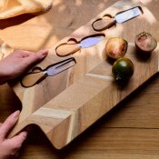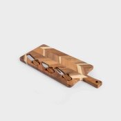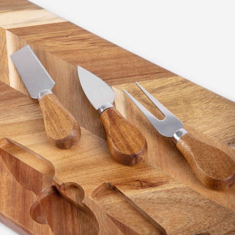 Ploča je izrađena od prirodnog drva, a dodaci su od visokokvalitetnog nehrđajućeg čelika s drvenim ručkama.