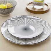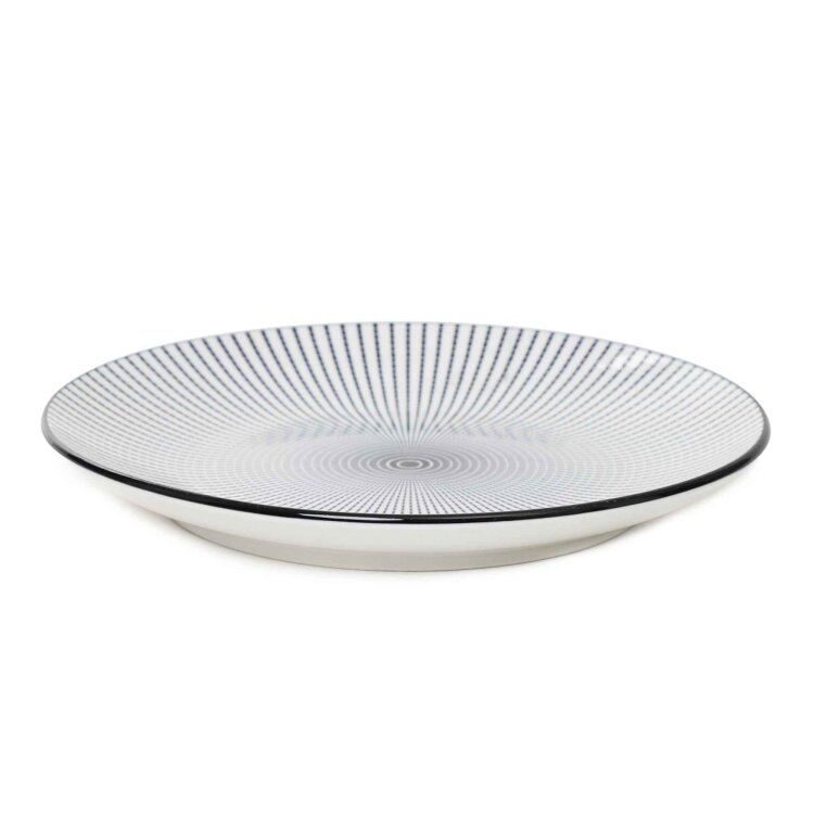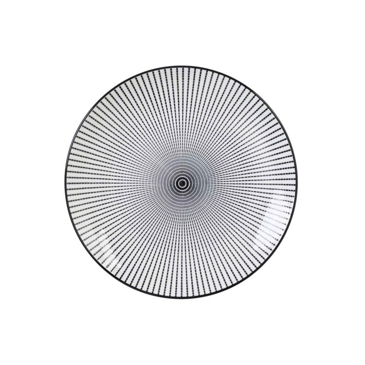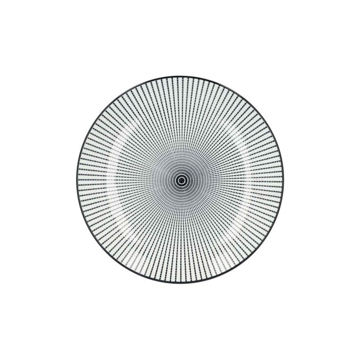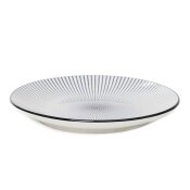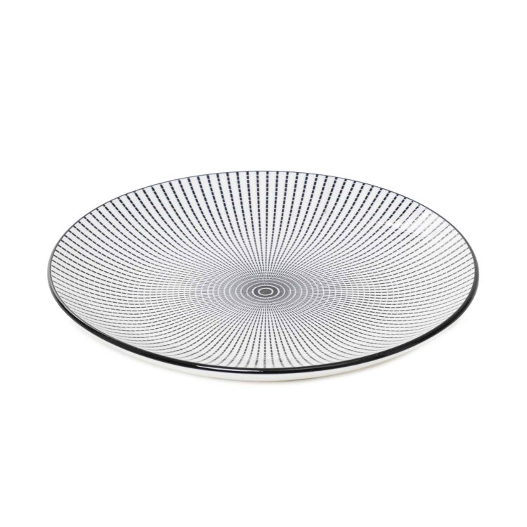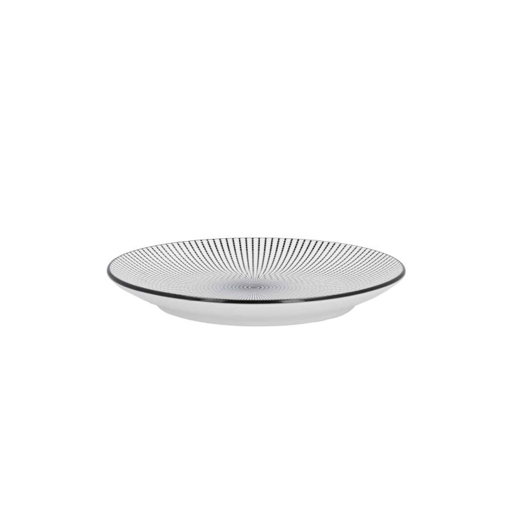 Desertni tanjur NAVIA je okrugao i ima promjer od 19 cm. Njegov jedinstveni ukras sastoji se od zanimljivog, minimalističkog uzorka u kojem se na bijeloj pozadini pojavljuju isprekidane linije koje se šire iz središta tanjura stvarajući optičku varku. Cijeli komad je ukrašen u kontrastnim crno-bijelim bojama.
